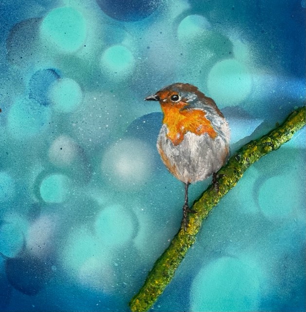 roodborstje op blauwe achtergrond.