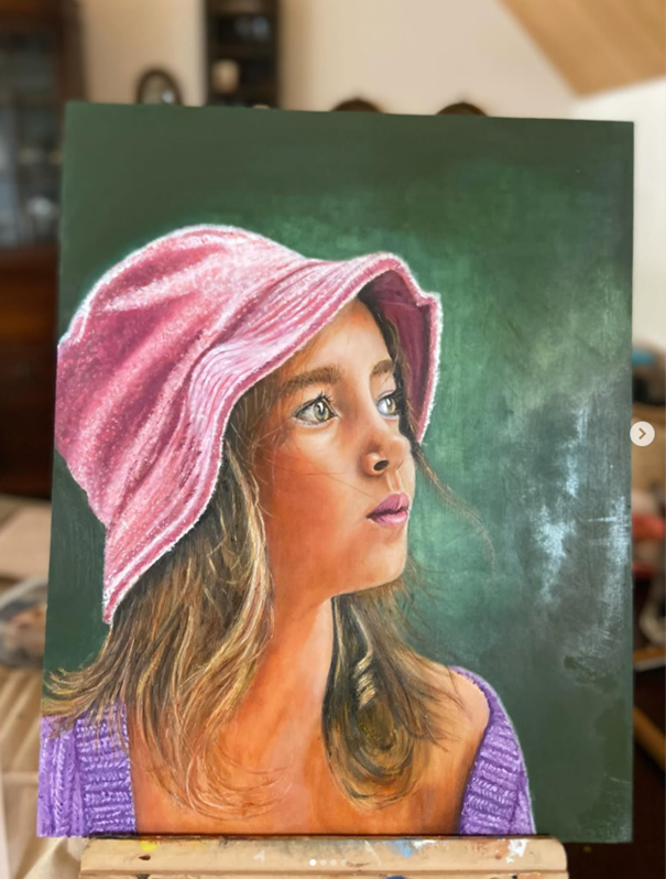 Ik vind het leuk om met verschillende materialen te werken zoals acryl, houtskool, aquarel, kleurpotlood en de laatste tijd vooral olieverf.